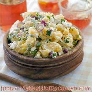 Overgiet met de beste olijfolie van koude persing. Kruid met peper en zout en giet er wat vers geperst citroensap over. Wie een onbespoten citroen heeft, kan ook wat zeste van de schil bij in de salade raspen. Roer alles door mekaar en Jamie Oliver's basis aardappelsalade is klaar!